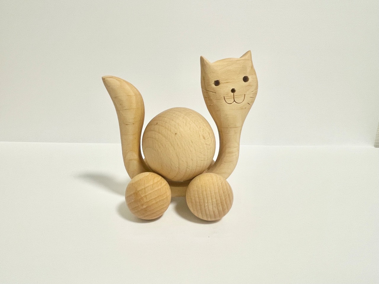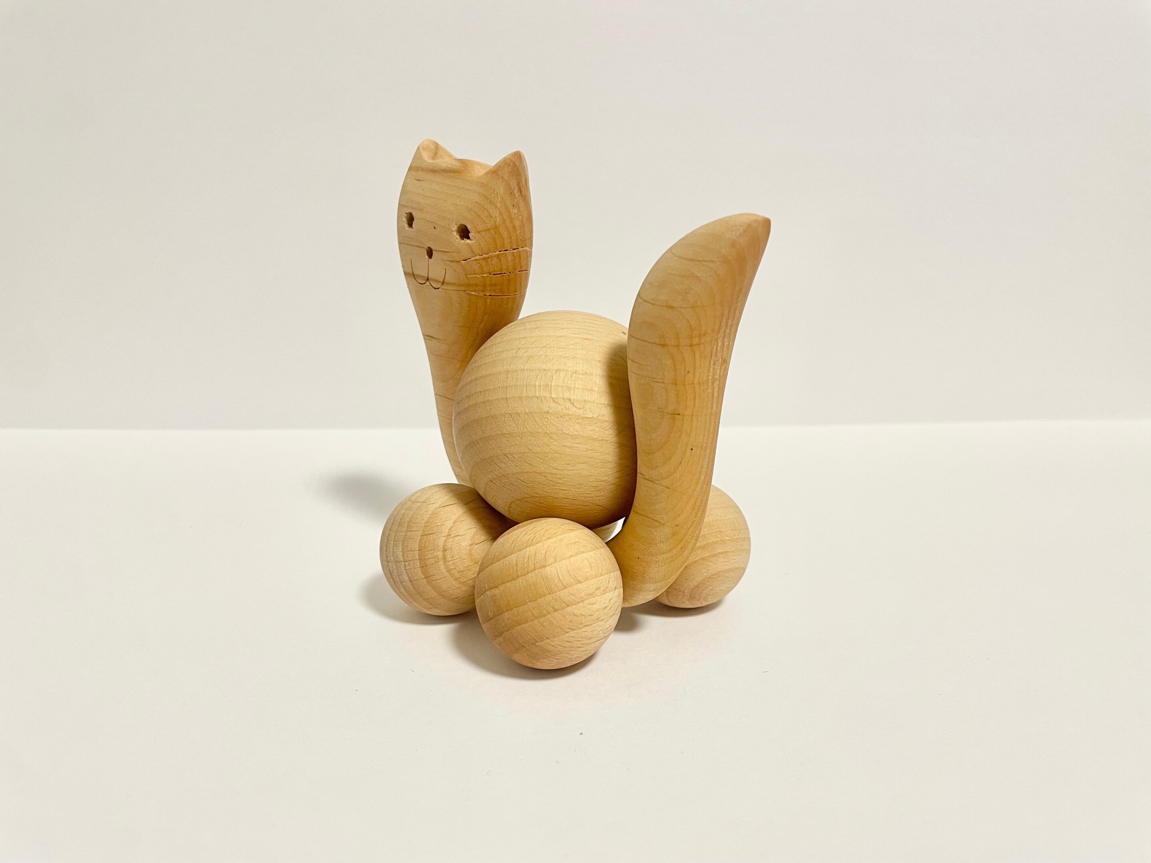 まん丸のフォルムが可愛い木製の猫オブジェ。横に動かすと、足元にある木の玉がコロコロと転がり、思わず笑みがこぼれるユニークな仕掛けになっています。